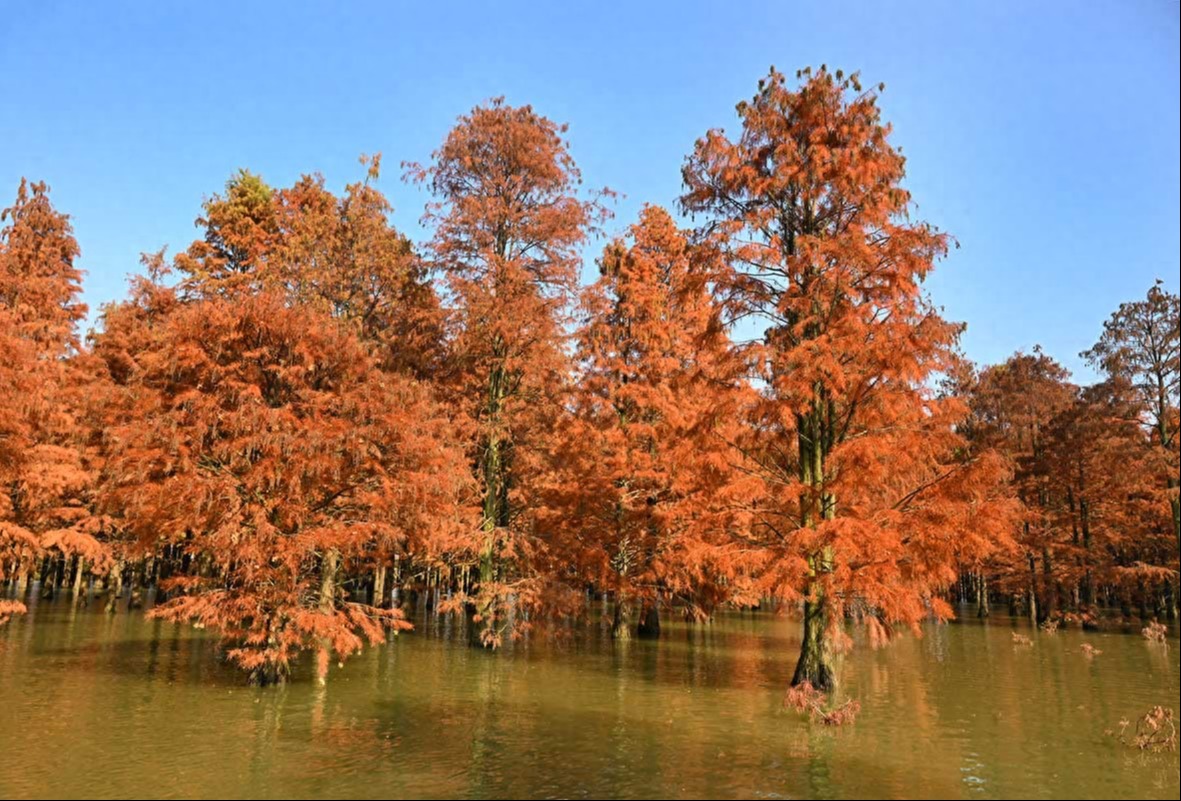 时值冬日大雪时节,合肥市庐江县柯坦镇大汉塘里的红杉林,倒映在清澈明净的水面上,美轮美奂,风情万种,宛如五彩缤纷的调色板,充满着诗情画意。乘船穿行其中,仿佛进入一幅多彩绚烂的冬日画卷。此情此景,吸引了众多游客纷至沓来,更受到端着长枪短炮的摄影爱好者的青睐。