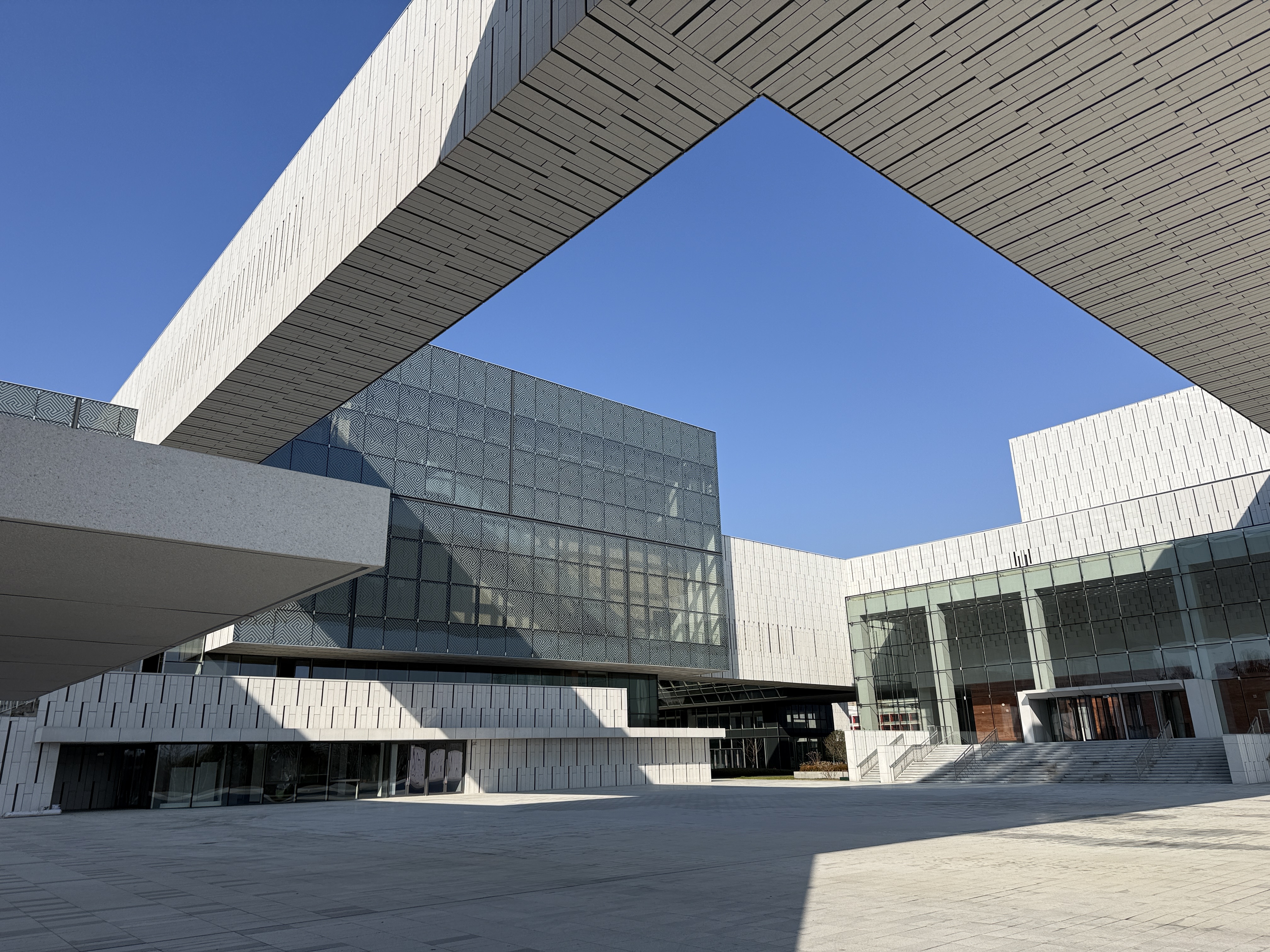 “两馆”建筑采用回字形合院式设计,既分亦合,取意安徽传统民居的建筑智慧。为让古老的文化基因在现代建筑中焕发新生,项目特别邀请了徽州三雕(石雕)国家级非遗代表性传承人冯有进参与建设。在冯老的指导下,项目团队将非遗技艺巧妙融入建筑肌理。建筑外墙采用渐变肌理的石材,通过细腻的凹凸错动,再现安徽传统民居的韵味。玻璃幕墙的设计更是别出心裁,通过数码打印彩釉技术,传统木雕上的几何图案被转译到现代玻璃上,当阳光透过时,地面上便洒满了徽州文化的斑驳光影。室内空间以白色石材为主基调,局部运用丹青、木黄、朱红等传统色彩进行跳色处理,实现了“非遗语言的现代表达”。