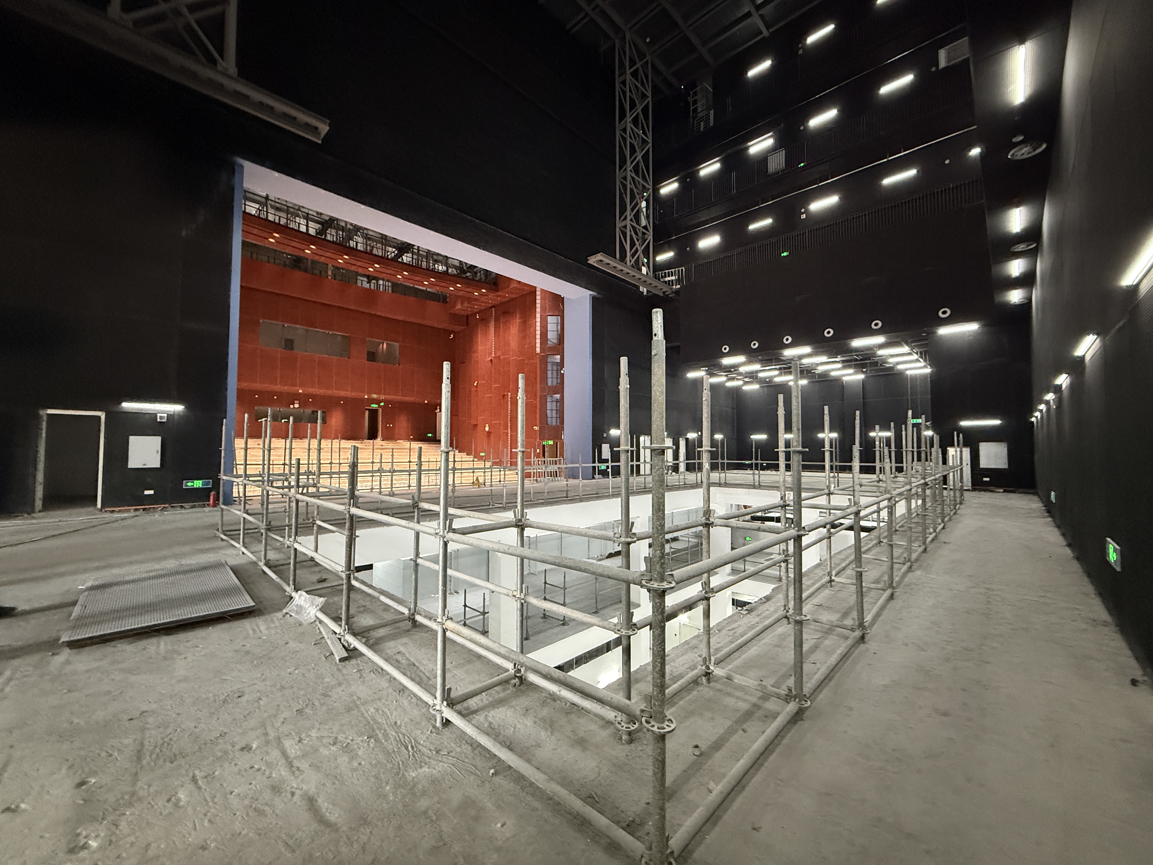 站在文化馆主舞台区域仰望,40.3米的层高令人震撼。“这是目前安徽省在建公建项目中最高的大型舞台空间。”项目经理向力说,舞台屋面采用斜屋面设计,北高南低,屋面南北方向的所有结构梁均为重型斜梁,同时还分布着53个钢结构预埋点,不同标高的异型结构错综复杂。“最大的挑战在于如何安全高效地搭建这个‘高空骨架’。”技术负责人陈亚指着复杂的结构图说。